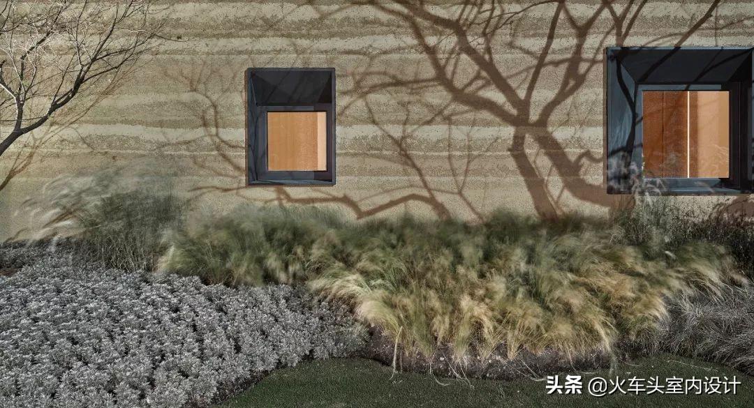 墙面材料以质朴的夯土、毛石、竹木墙板为主要基调,强调建筑的生长感和在地性。
