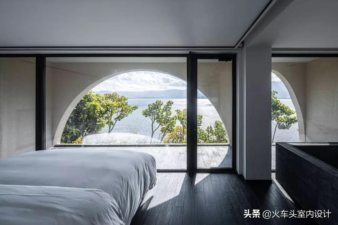 打开后是一间被屏风挡住的黑色门厅,光线已经透了进来,空气中似乎有蝴蝶翅膀的煽动声。你会迫不及待地拉开房门,是的,洱海就这么迫不及待跳了进来。