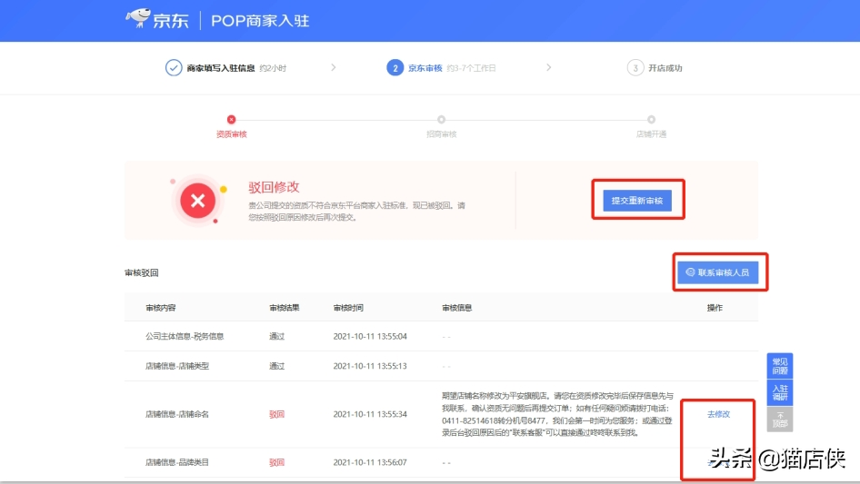 提交入驻申请后,可在入驻申请页面按照驳回意见修改重新申请即可,pop商家分为四个环节: