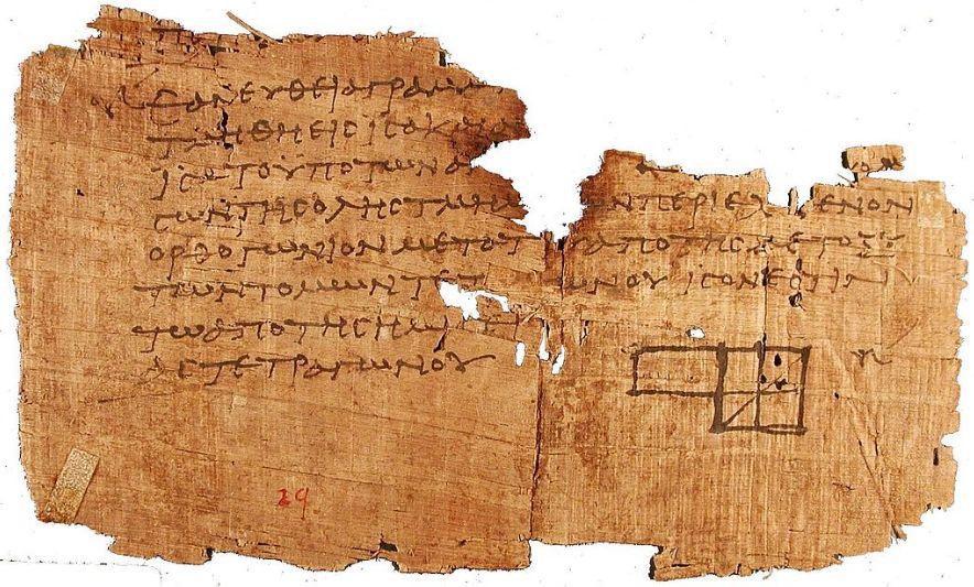 俄克喜林库斯29号莎草纸,现存最早的几何原本残页之一,在俄克喜林库斯发现的,其年代约为西元后100年。插图和第2卷的命题5相同