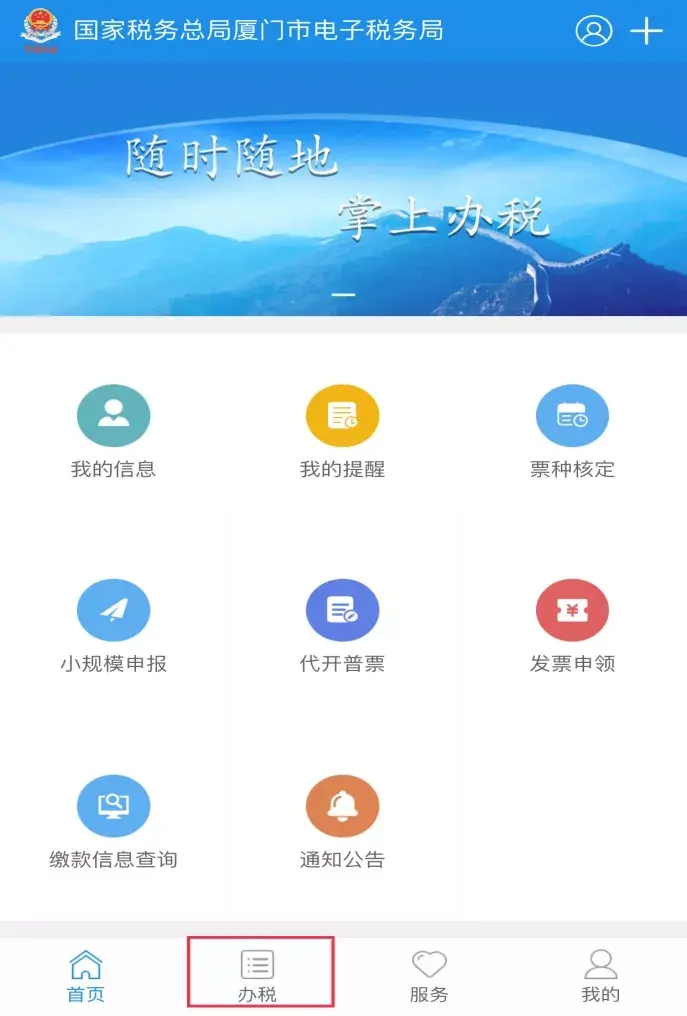 登录“厦门税务APP”,点击【办税】。