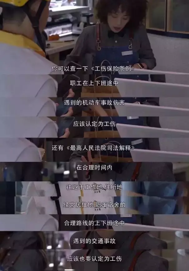女主告诉外卖小哥,他的父亲因为是在上班路上受的伤,所以属于工伤。在外卖小哥强调:“可他自己是骑摩托车摔的”,女主说那也算工伤,还引用了法条:“在上下班途中,受到机动车事故伤害的,应该认定为工伤”。