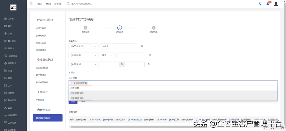 2.合计字段:合同报表中的合计字段可以选择“金额”、“回款金额”和“消费金额”,您可以根据需要进行选择。