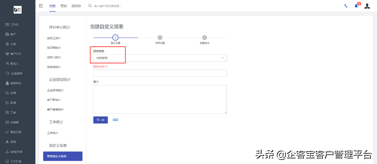 进入创建自定义报表页面,选择报表类型为“合同报表”,并输入报表名称和简介,点击“下一步”。