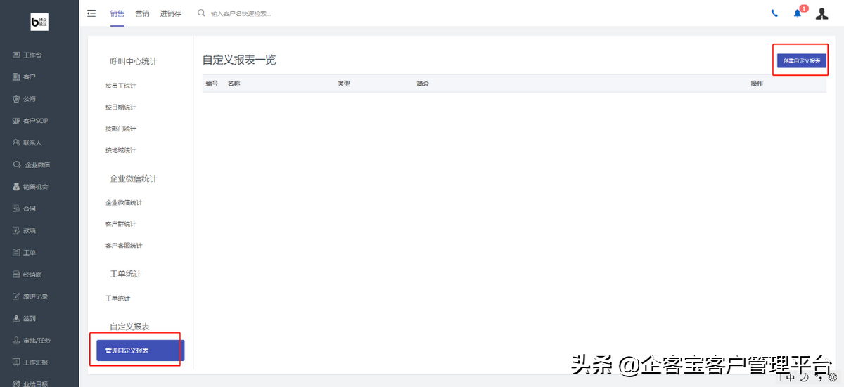 登录企客宝SCRM系统后,点击左侧菜单栏的“统计分析”模块,进入页面后再点击“自定义报表”下的“管理自定义报表”,然后再点击右上角的“创建自定义报表”。