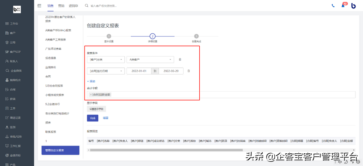 进入自定义报表的详细设置页面,可设置报表的搜索条件、合计字段和显示字段,在页面下方显示报表预览。
