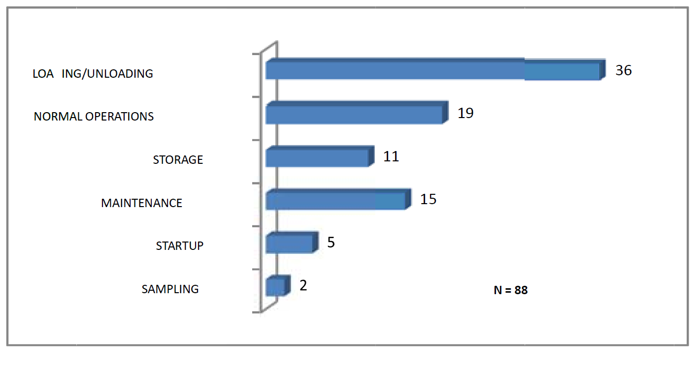 虽然有11起事故(占13%)发生在存储过程中, 其中有4起事故是发生对储存采取某种类型干预措施期间。超过 22% 的事故(19 起)发生在正常操作运行期间,这意味着研究报告没有将液化石油气储罐上进行任何直接活动作为触发系列事故的因素。