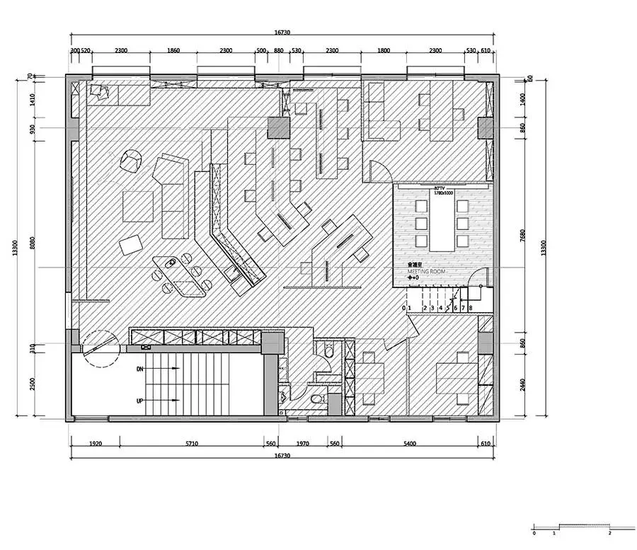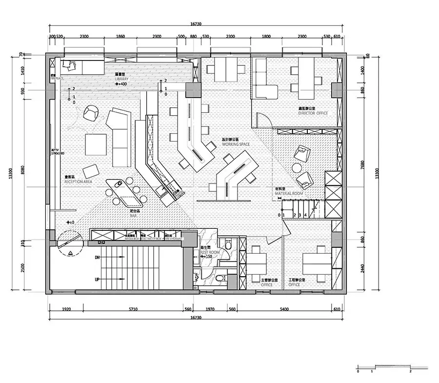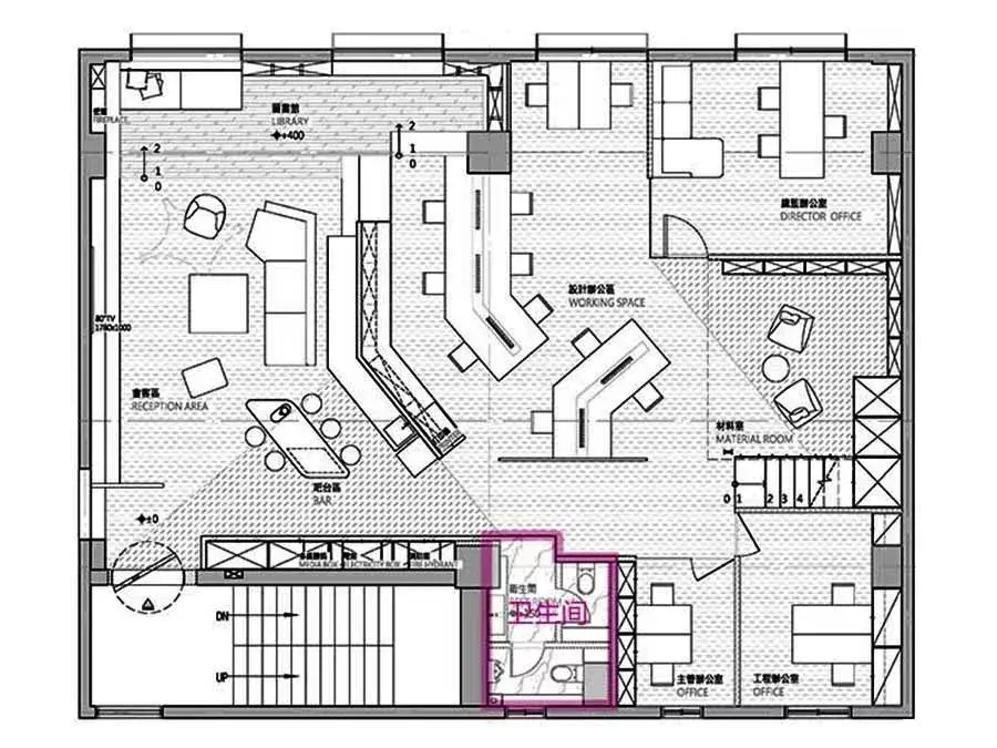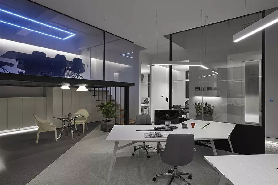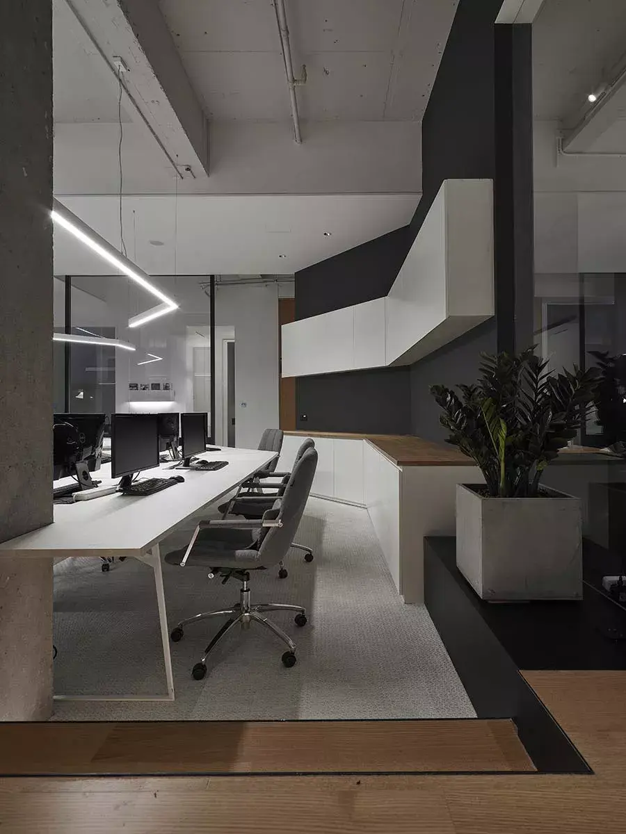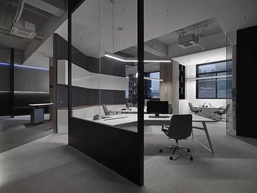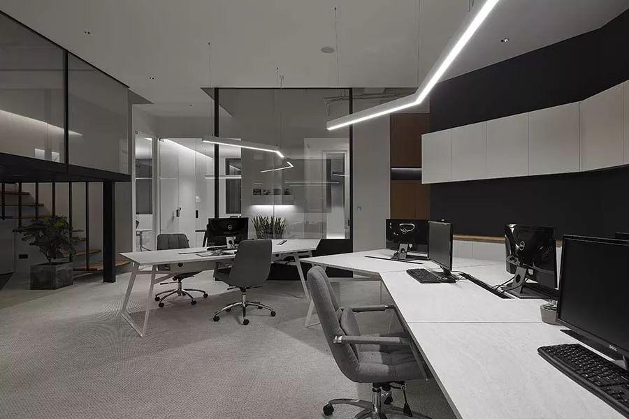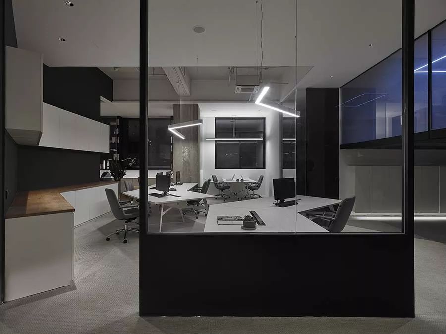 延伸130度的设计,将最大空间范围保留给办公区;当中除了工作区,并涵盖总监办公室、主管办公室及工程办公室等,满足工作使用需求。