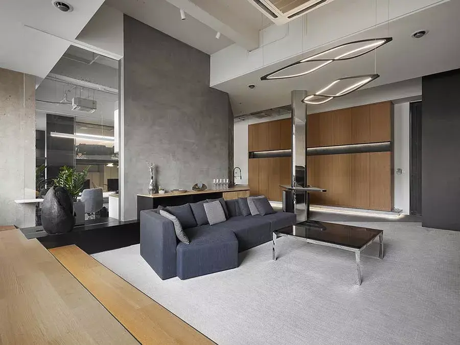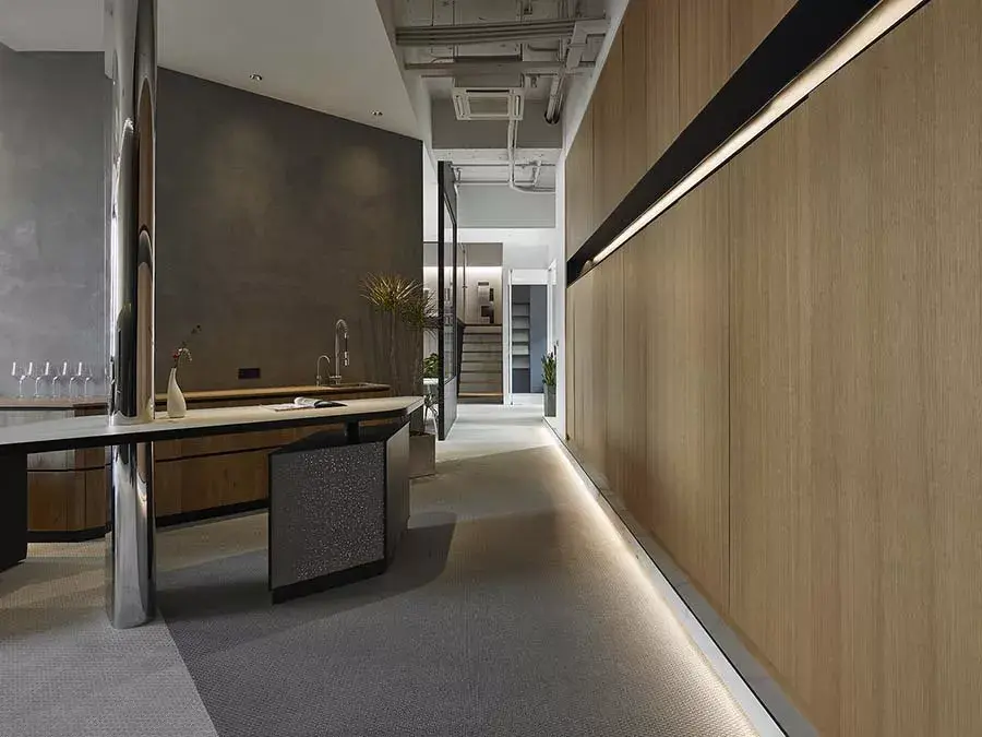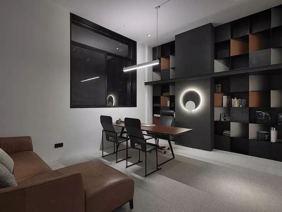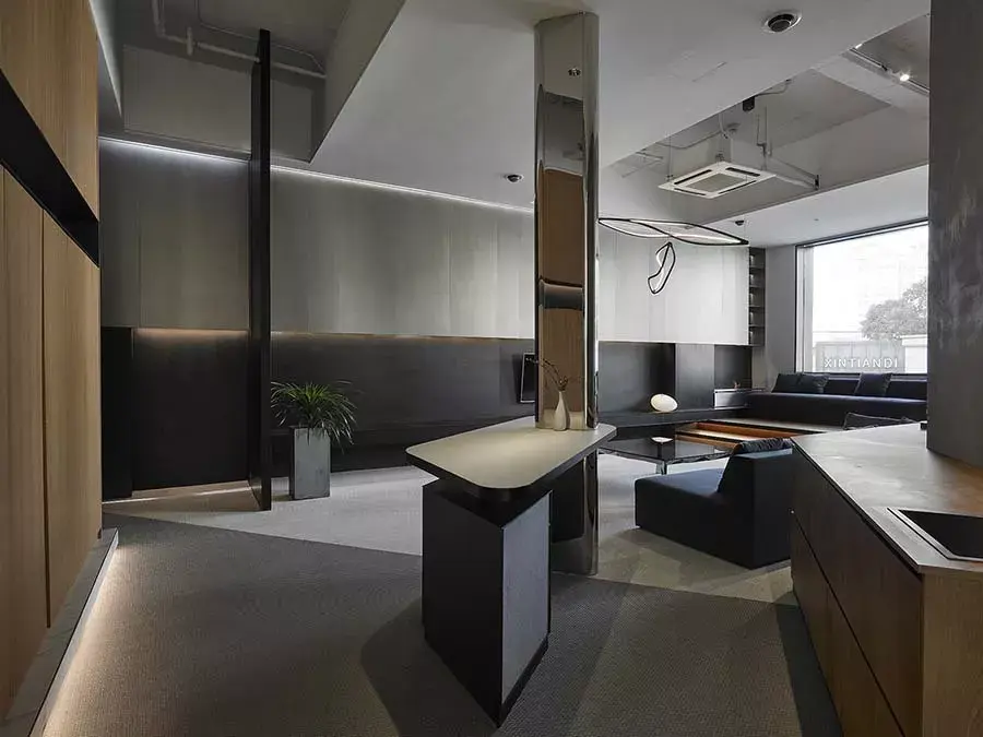 穿越玄关来到接待休闲区,设计师解构原本单调的墙面,将上半部打造为银灰色不锈钢墙体,下半部则规划黑色锈铁墙及台面,形成稳定的空间关系,也营造沉稳的氛围。