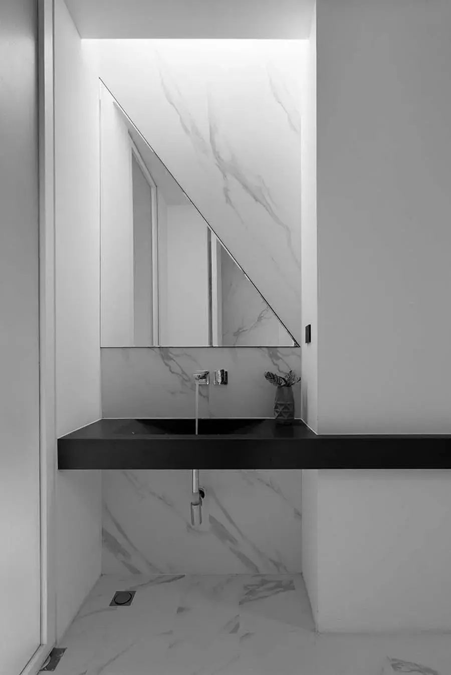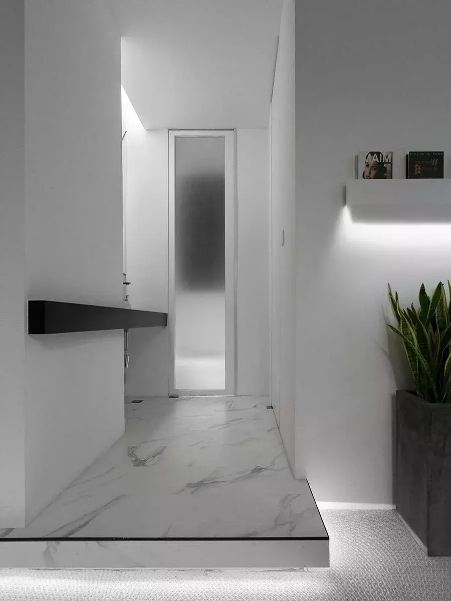 抬高的走道串连2间卫生间,这样设计除了解决管道改造问题,并增加空间中的体量关系。另地面选用白色石纹铺设,为纯白空间平添层次变化。