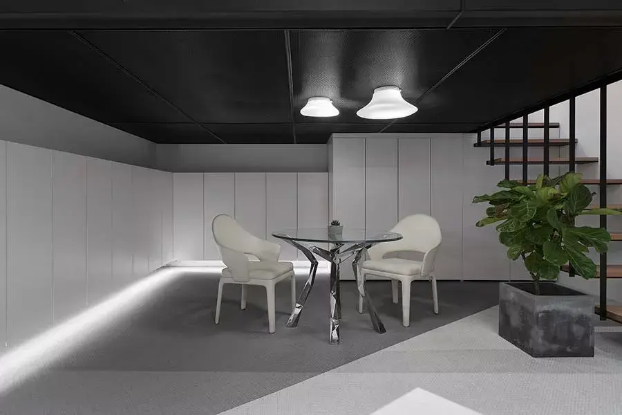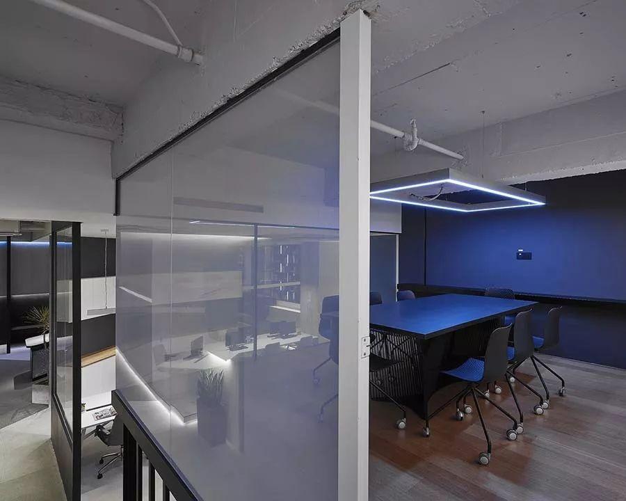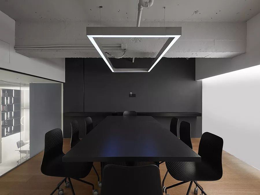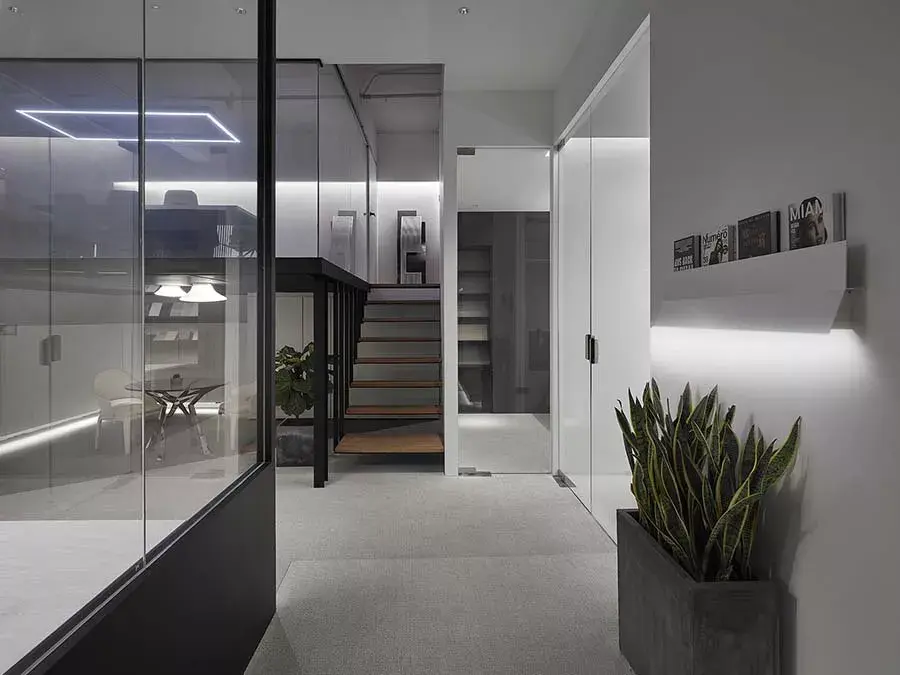 跃层上方为会议室;会议室采用电子玻璃,在虚实之间变化,兼具遮蔽的作用。其次,避免层高不足而导致压迫感,天花不封顶,以维持基本的舒适高度。至于连结一、二层的楼梯,则采开放式设计,利于视线穿透,也有间接延伸视觉空间的效果。