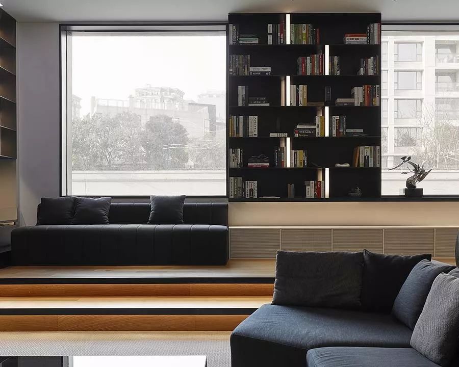 窗边处利用高台设计,规划为图书馆区;由于邻窗的优势,设计师顺势以大窗作为设计思路,让阳光洒入沙发与书柜的间隙,既营造温暖的阅读环境,也借着充沛的日光,明亮室内空间。