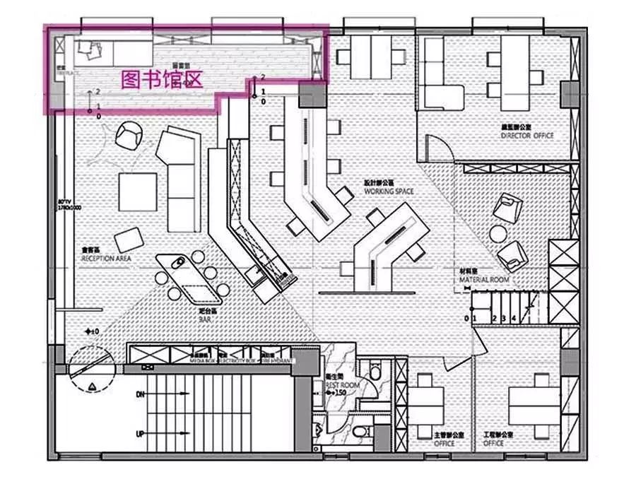 释放4.8米层高优势,并将原本相对封闭的空间改采开放式布局,重新规划出接待休闲区、图书馆区、创意办公区及卫生间,并运用部分高度空间打造跃层,下方作为物料区,上方则是会议室;最后,再运用低饱和度的中性色彩及暖色灯光,以及透过与材质的碰撞,勾勒出高质量的整体氛围。
