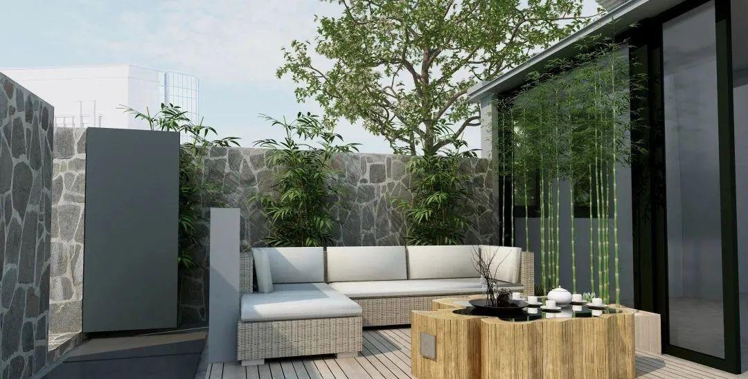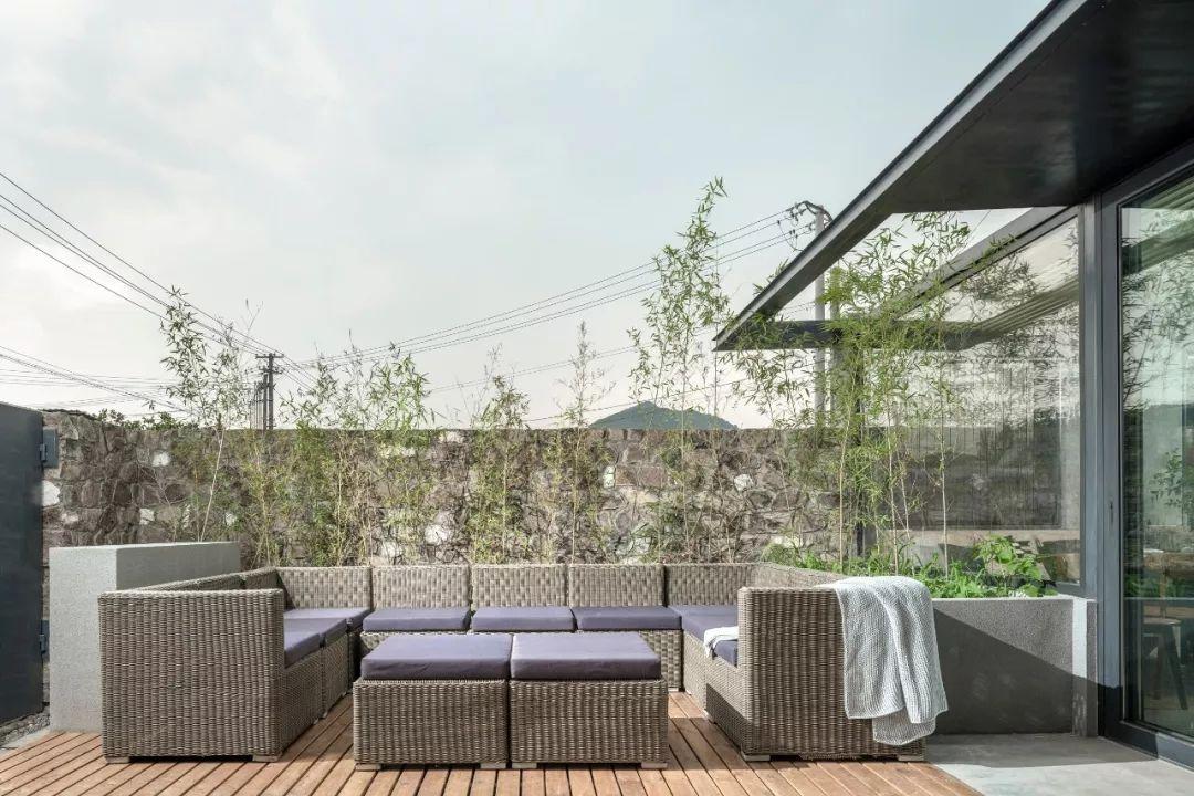 庭院之中,暖色编织质感的沙发椅,围合出欢聚的氛围,水泥花坛里野蛮生长的绿植与竹子、石墙面为近景;矮山与蓝天为远景,让就餐的氛围更加“原生态”。
