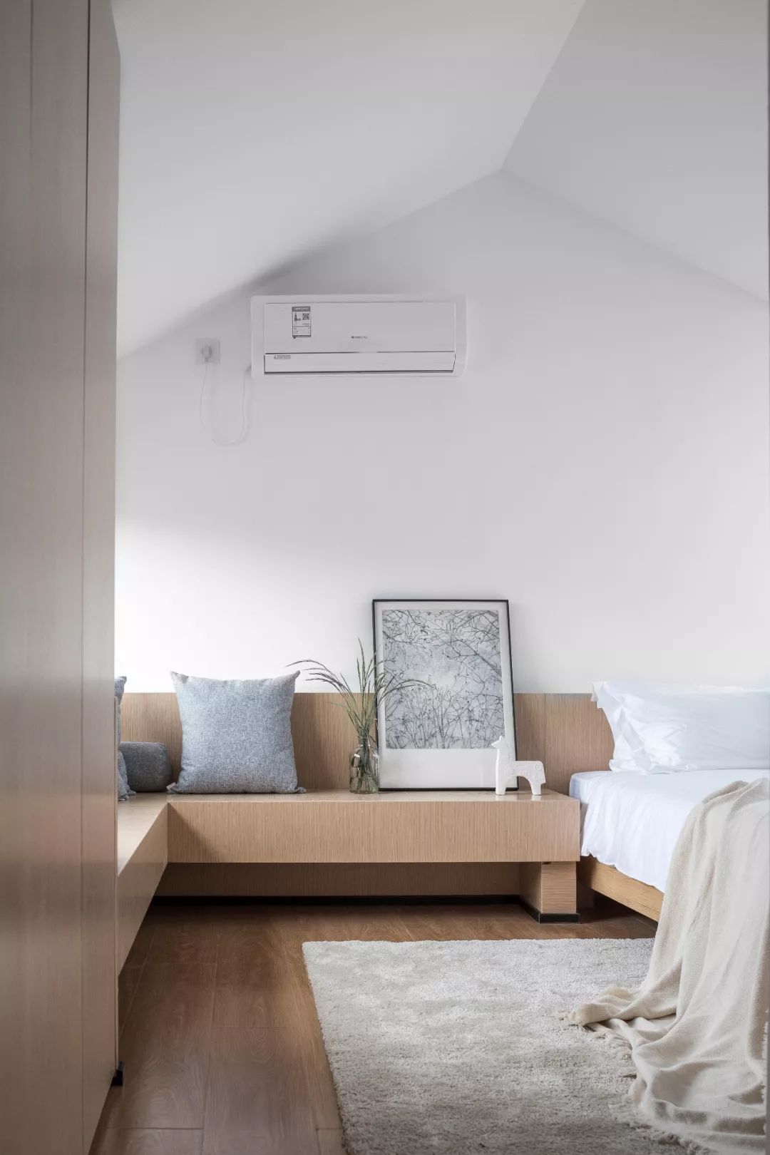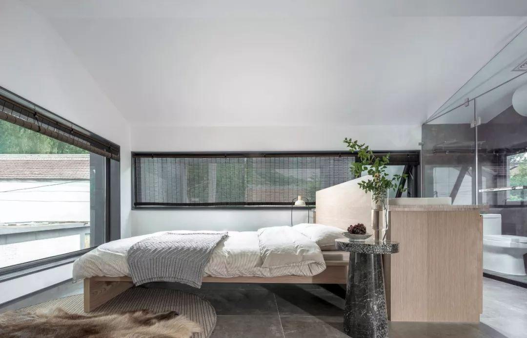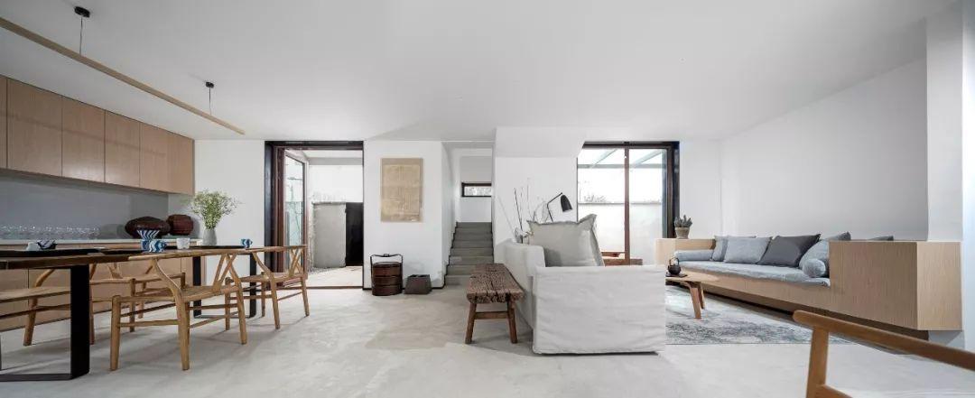 室内以白色为主调,原木和水泥等室外材料延伸进来,整体景致与庭院相得益彰。