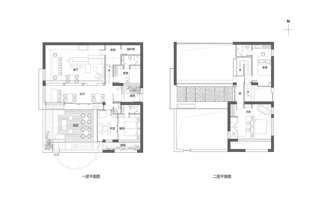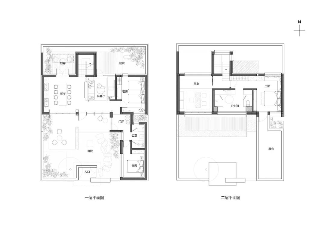 建筑设上下两层,第一层为公共空间与客房,二层则是完整的主卧空间,拥有一间茶室和一个室外大露台,这为相对私密的空间置入了亲近自然的生活情致。