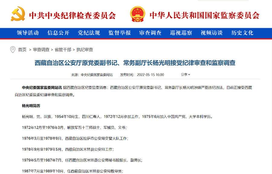 据西藏自治区纪委监委5月15日消息,西藏自治区公安厅原党委副书记、常务副厅长杨光明涉嫌严重违纪违法,目前正接受西藏自治区纪委监委纪律审查和监察调查。