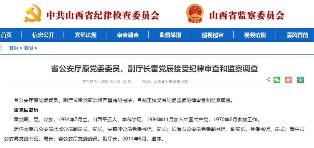 2021年12月9日消息:山西省公安厅原党委委员、副厅长雷党辰涉嫌严重违纪违法被查。