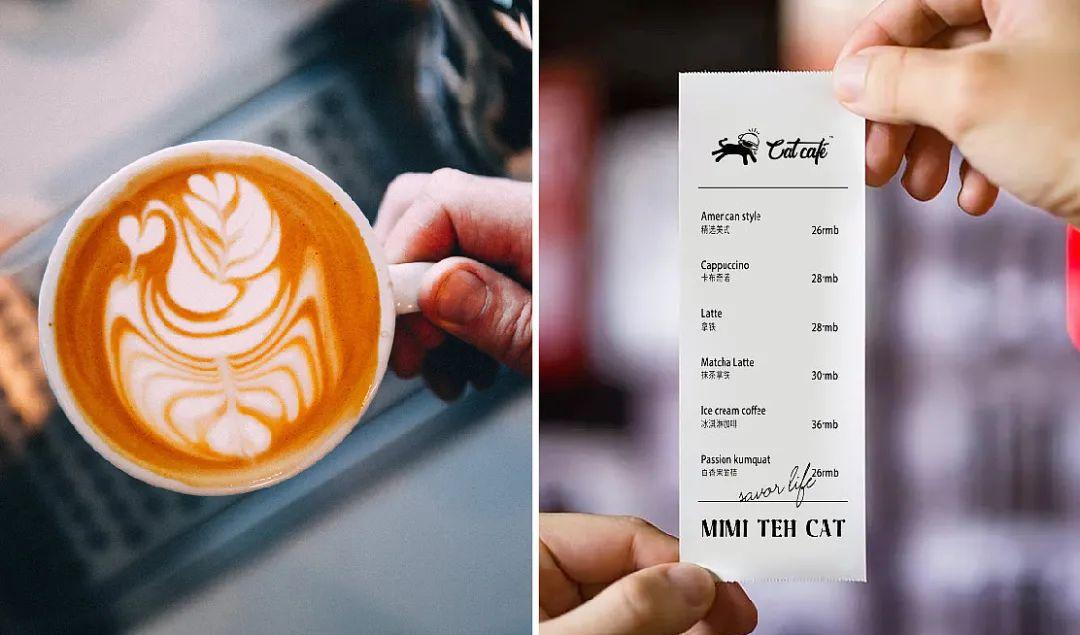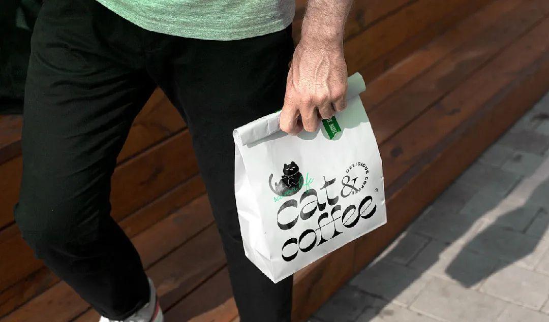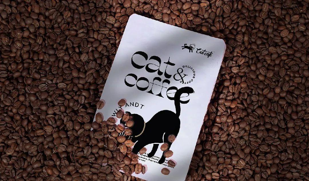 在品牌LOGO方面,采用了图形+字体的组合,名称“Cat cafe”采用了手写字体,从视觉上给消费者传达着随性、自由的态度。图形设计成一只套着咖啡杯的猫咪,凸显品类属性。