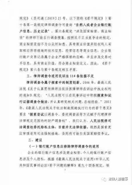 近期,江苏省高院《关于印发关于依法保障律师调查取证权的若干规定的通知》印发后,引起了各金融机构高度关注,现将他们的建议整理归纳如下,供贵院参考: