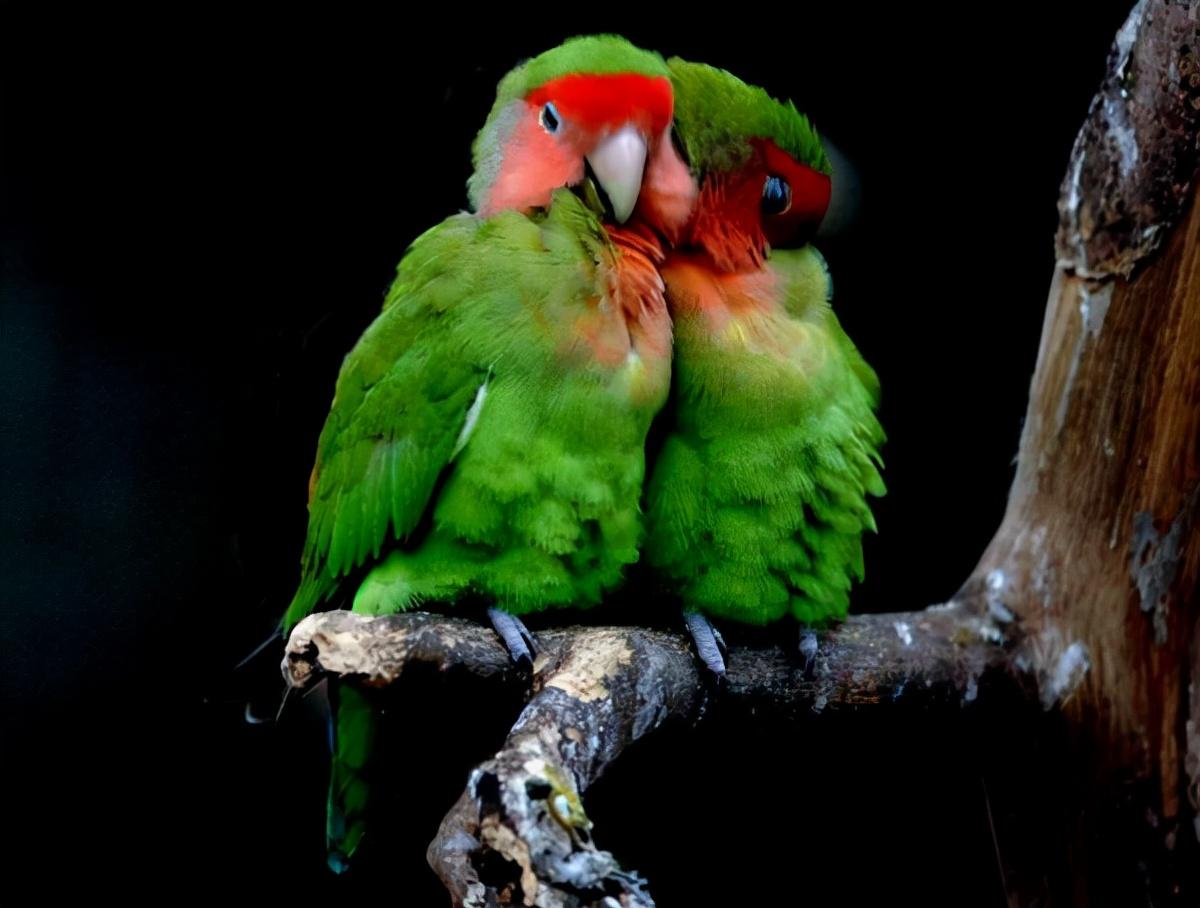 桃脸牡丹鹦鹉。桃脸牡丹鹦鹉因脸颊呈红色,和桃子颜色相近,再加上与自己的另一半形影不离,所以又被叫做桃脸爱情鹦鹉或桃脸爱情鸟。