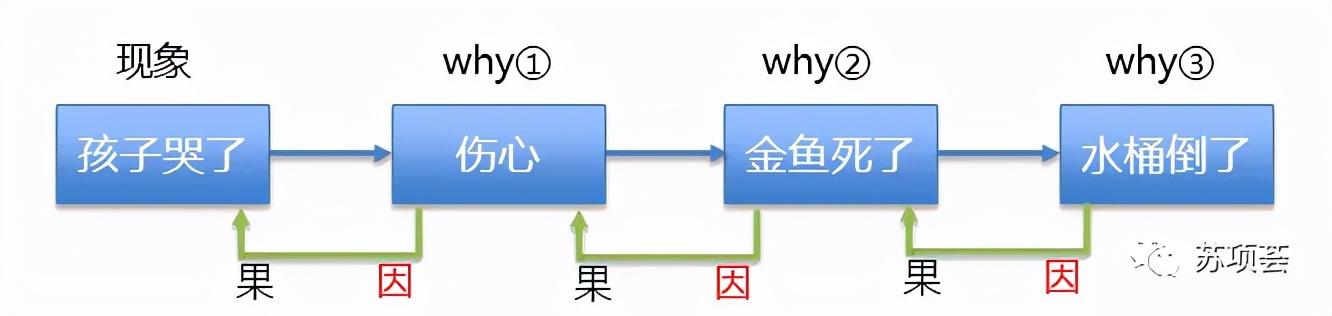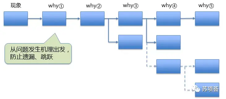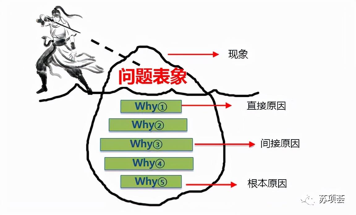 5Why核心是不急于立即解决表象问题,而是从结果着手,沿着因果关系链条,顺藤摸瓜,挖出问题根源,从而找到长期对策。