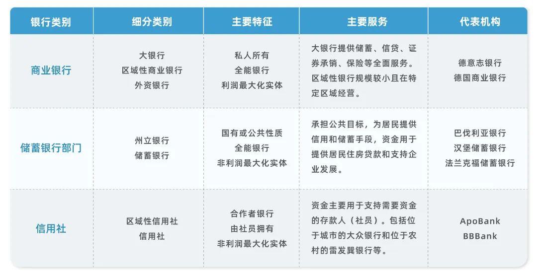这里要注意,德国的商业银行与中国的商业银行不同。德国的商业银行是一个所有制的概念,是指私人所有的银行,区别于公共性质的储蓄银行和信用社;中国的商业银行主要是指商业化导向的银行,与所有制无关。