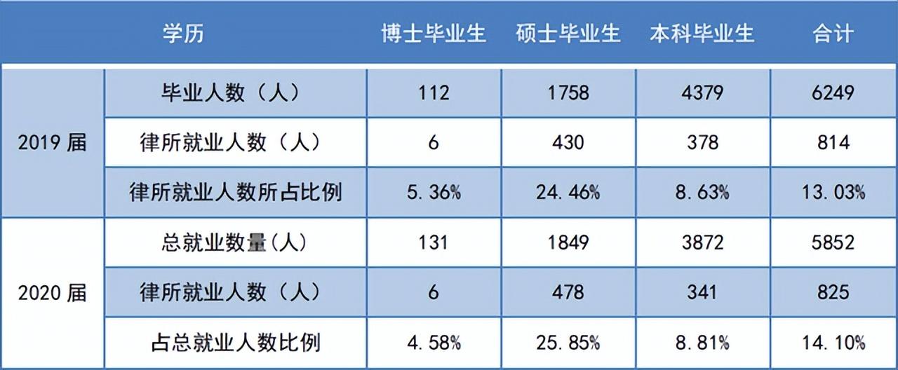 西南政法大学近两届的毕业生总体就业情况中,对于律师行业的选择没有发生太大变化,占总体毕业生人数的14%左右。选择律所就业的应届毕业生以硕士毕业生为主,其中硕士毕业生选择到律师事务所工作人数占比最高,占硕士毕业生总体人数的25%左右。