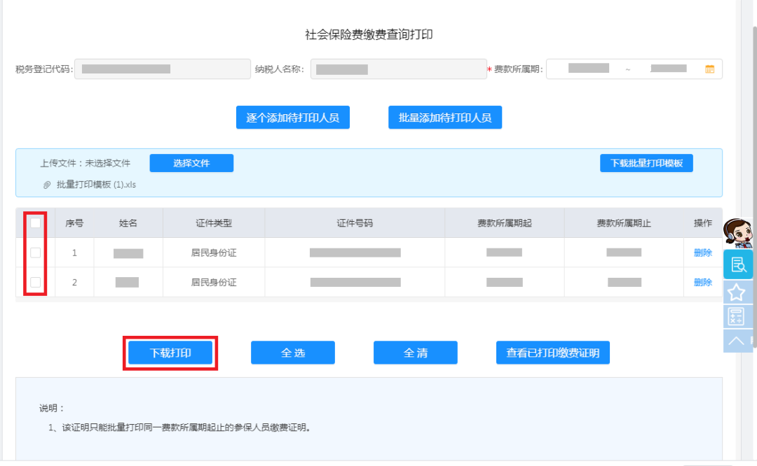 ②点击【批量添加待打印人员】的,下载批量参保模板,认真阅读填表说明和填写范例后填写人员信息,点击选择文件,选定文件打开,自动上传;