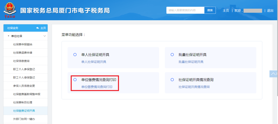 1.路径:【单位社保】-【社保缴费证明开具】-【单位缴费情况查询打印】。