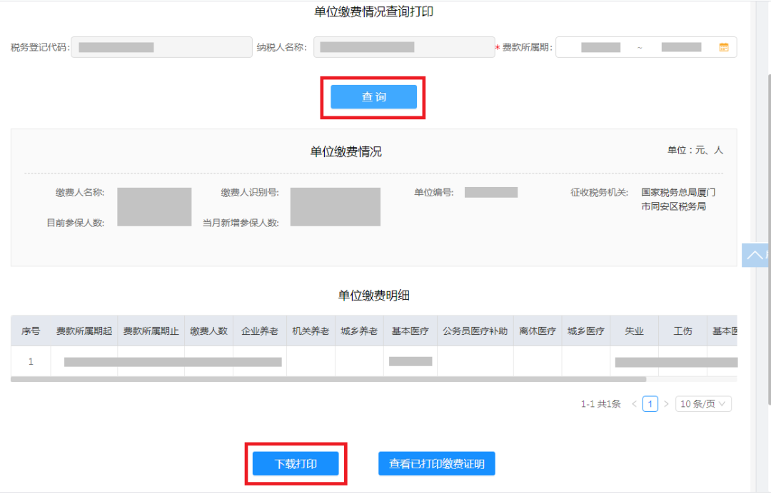 2.步骤:①输入【费款所属期】,点击【查询】,即可查询到相应所属期单位缴费情况及单位缴费明细,点击【下载打印】;