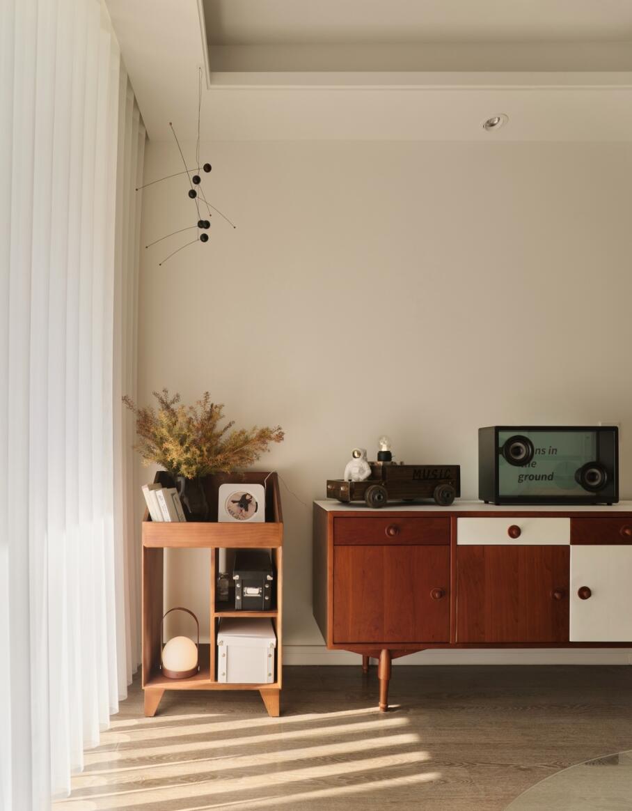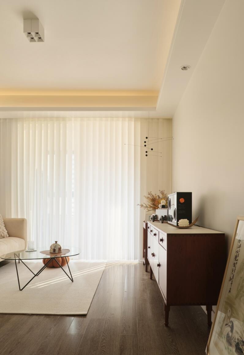 放弃电视墙,并增加一组成品装饰柜,不管是用来收纳,还是用来展示,都非常实用。而阳台移门,则做了正常保留处理,以便为室内提供更好的隔音隔热效果。