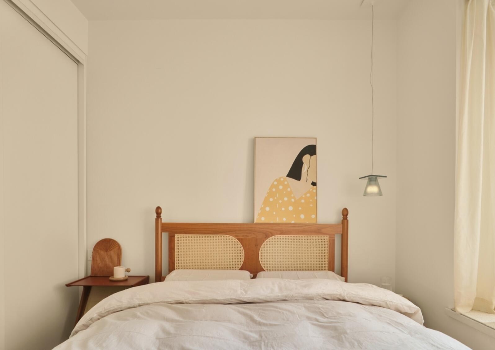 次卧是屋主的房间,整体延续了统一的色调,让空间与空间有了呼应。而藤编材质的实木床、搭配上棉麻质地的床品后,也在质朴、温柔的气息中,彰显出了舒适的质感,从而让心灵深处得到抚慰。