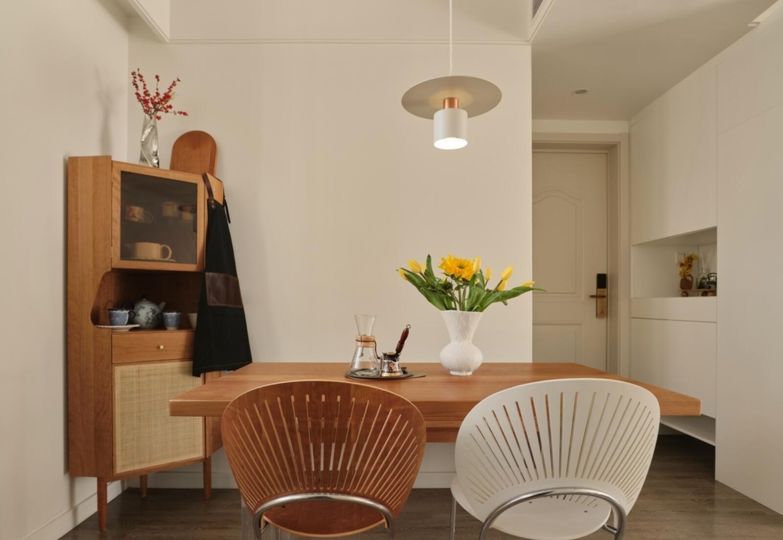 利用餐厅转角空间增加的三角柜,虽说收纳能力比较有限,但像一些日常的餐具,也算是得到了合理的收纳。而刻意选择两款饰面的餐椅,也在视觉上做到了和谐。