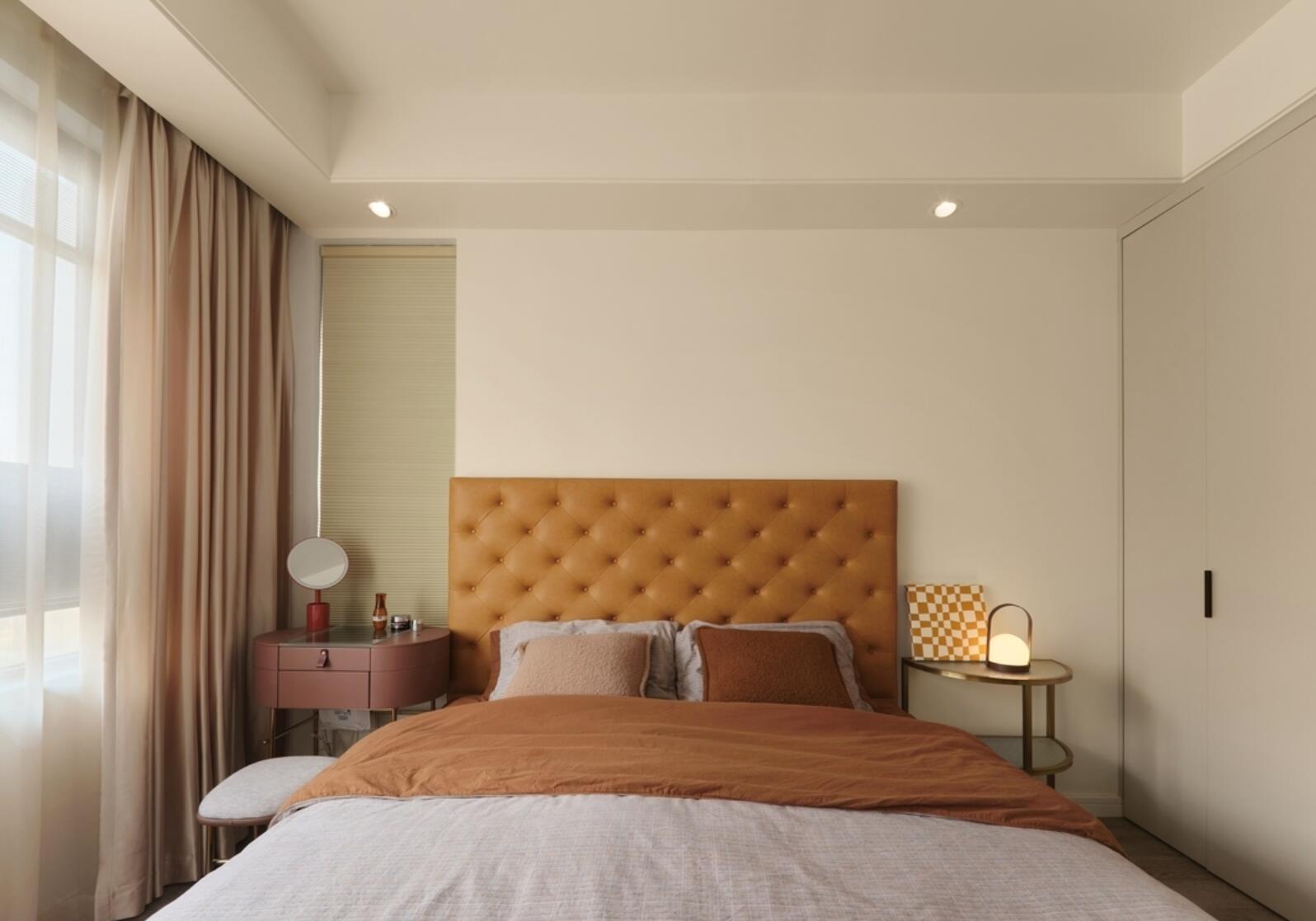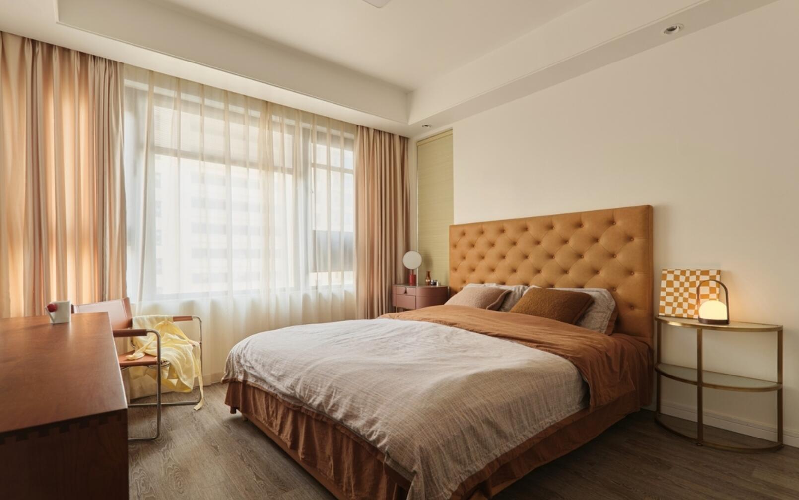 主卧是老人的房间,相较于其它空间,看似比较沉稳,实际上也让客厅的元素得到了延伸。比如焦糖色的床及窗帘配置,就让空间元素做到了呼应。再比如米黄色的墙顶面,也保持了统一的基调。而当外面的阳台纳进来之后,也让空间面积得到了有效的拓展。