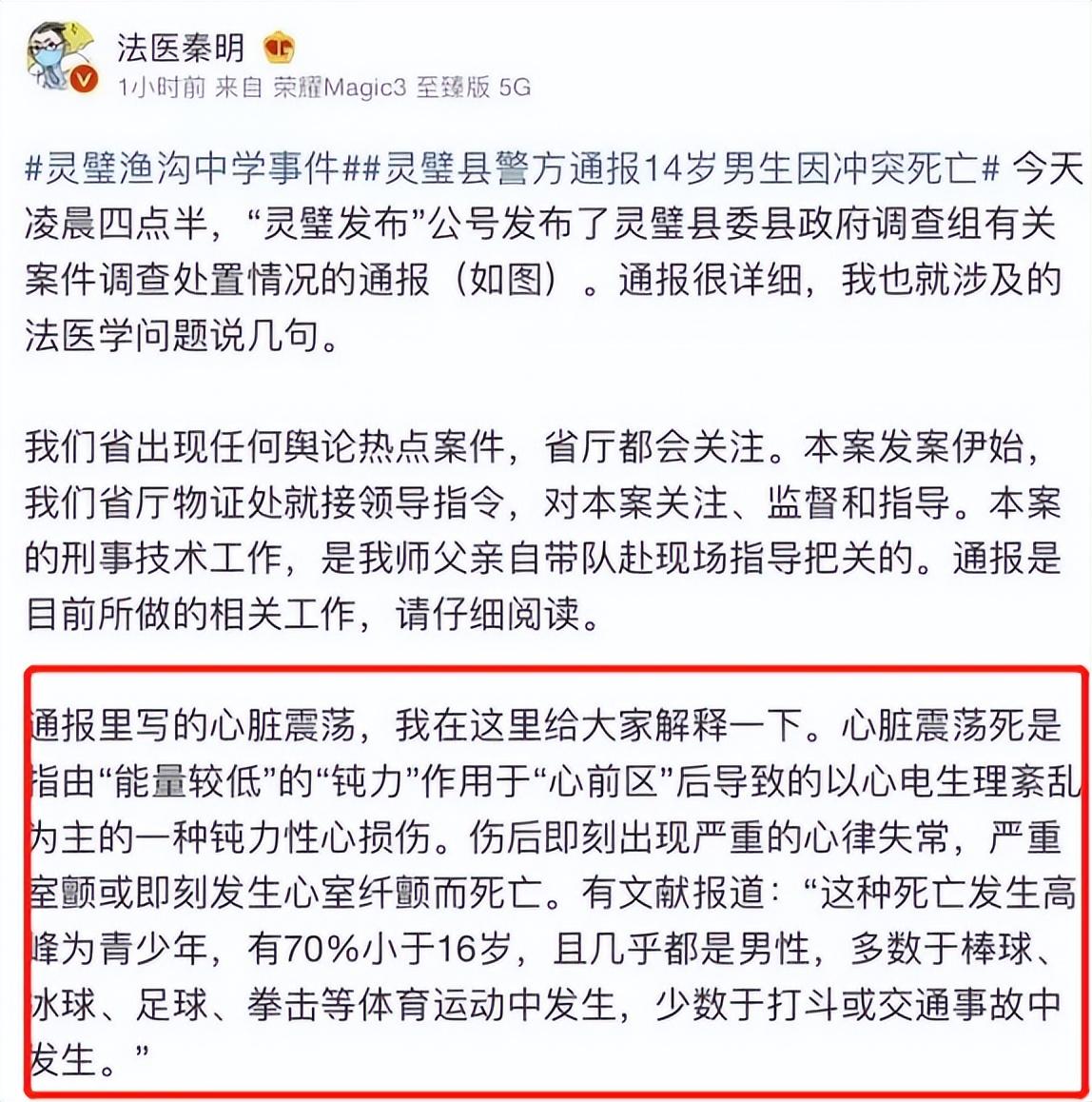 法医秦明在网上发布的内容里有明确说明“心脏震荡死”发生高峰为青少年,年龄大部分都不到16岁且多为男性。