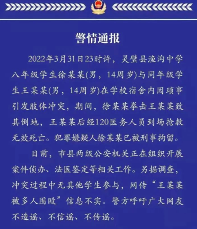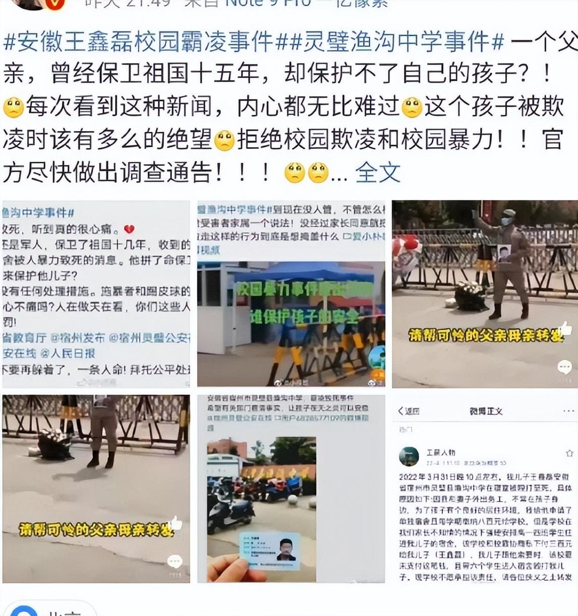 2022年愚人节这天,王守贺夫妇在安徽省灵壁县渔沟中学上学的14岁儿子在学校被同学“殴打暴力致死”。