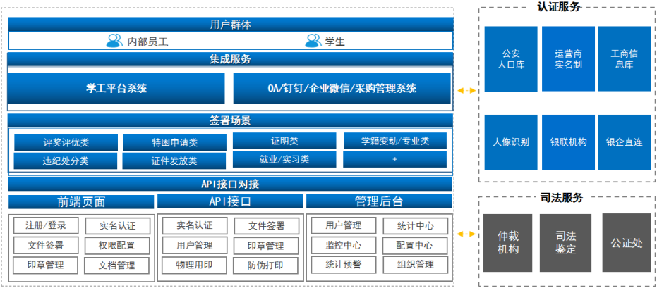 大多数高校都有自己的校园管理系统,但是只能做审批,盖章还是得打印出来,少不了人工二次录入,智慧校园目标大打折扣。