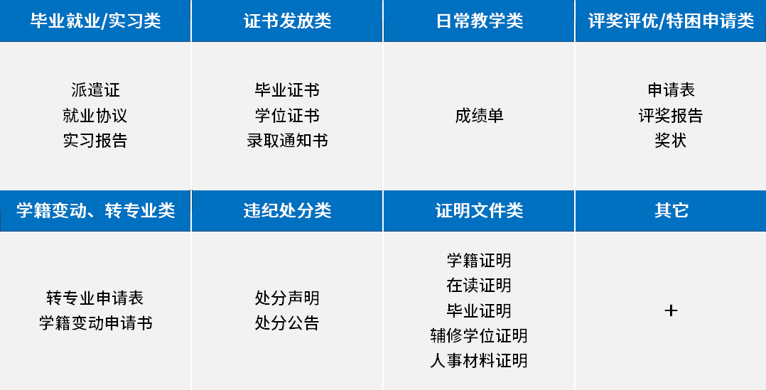 文件类型:学籍证明、在读证明、毕业证明、辅修学位证明、教师在职证明、教师职称证明、教师收入证明等。