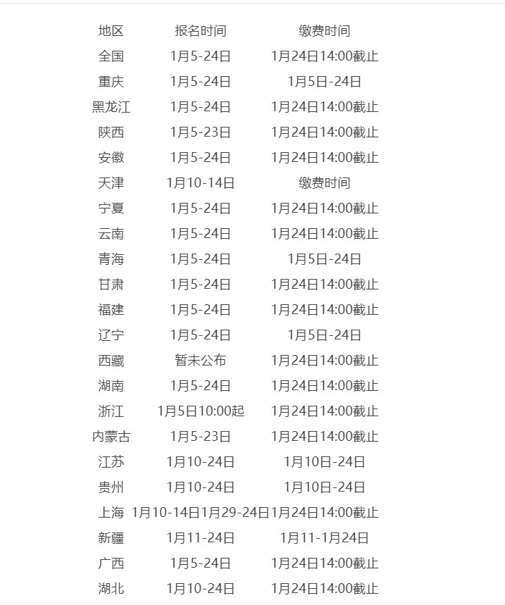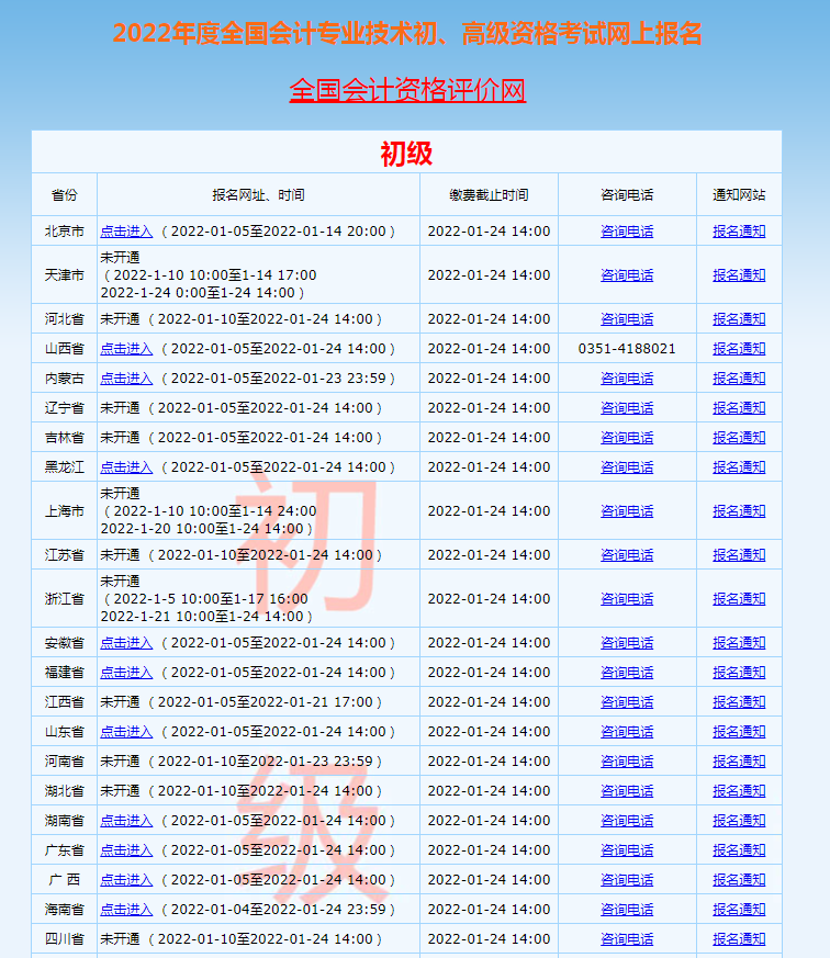 2022年初级各省报名时间不统一,大部分地区1月5日即可报名,少部分地区1月10日开始报名,详情如下: