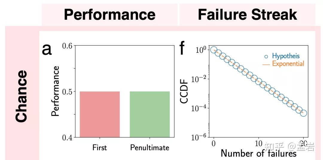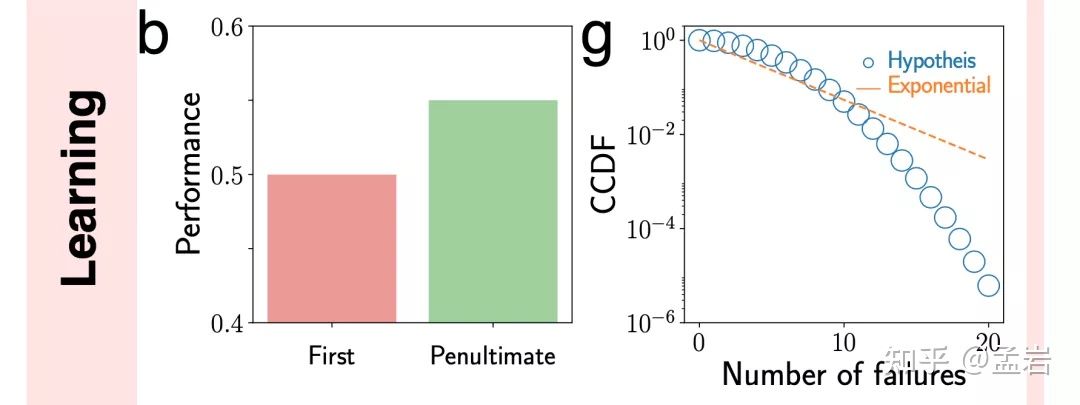 如果是这样的话,不断从失败中学习带来的能力提升,会减少获得成功所需要的失败次数。失败曲线(下面右图)应该呈现比「运气」模型的指数曲线更「窄」的分布。
