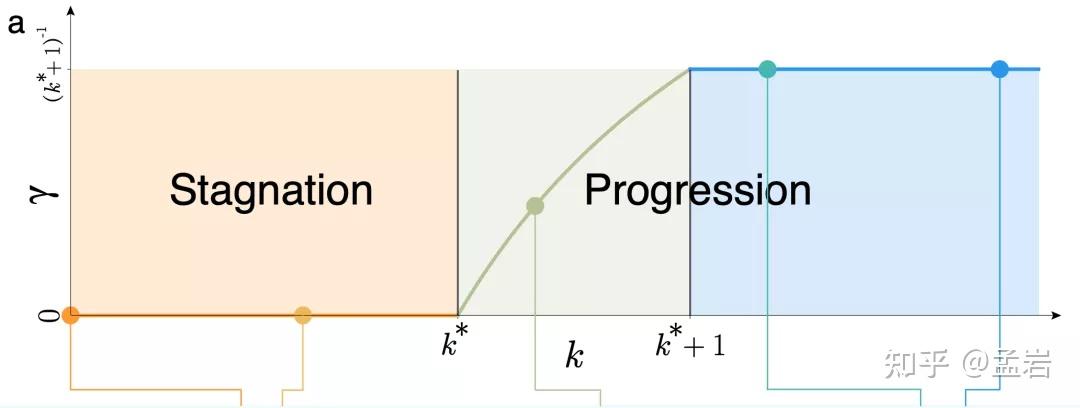 当 k 超过了某个临界值 k*,经验开始快速积累,说明系统进入到一个快速进步的区域,在这个区域,「不断尝试」会导致质量和效率的持续改进。上图中间的绿色区域(Progress),就对应着这个时期。