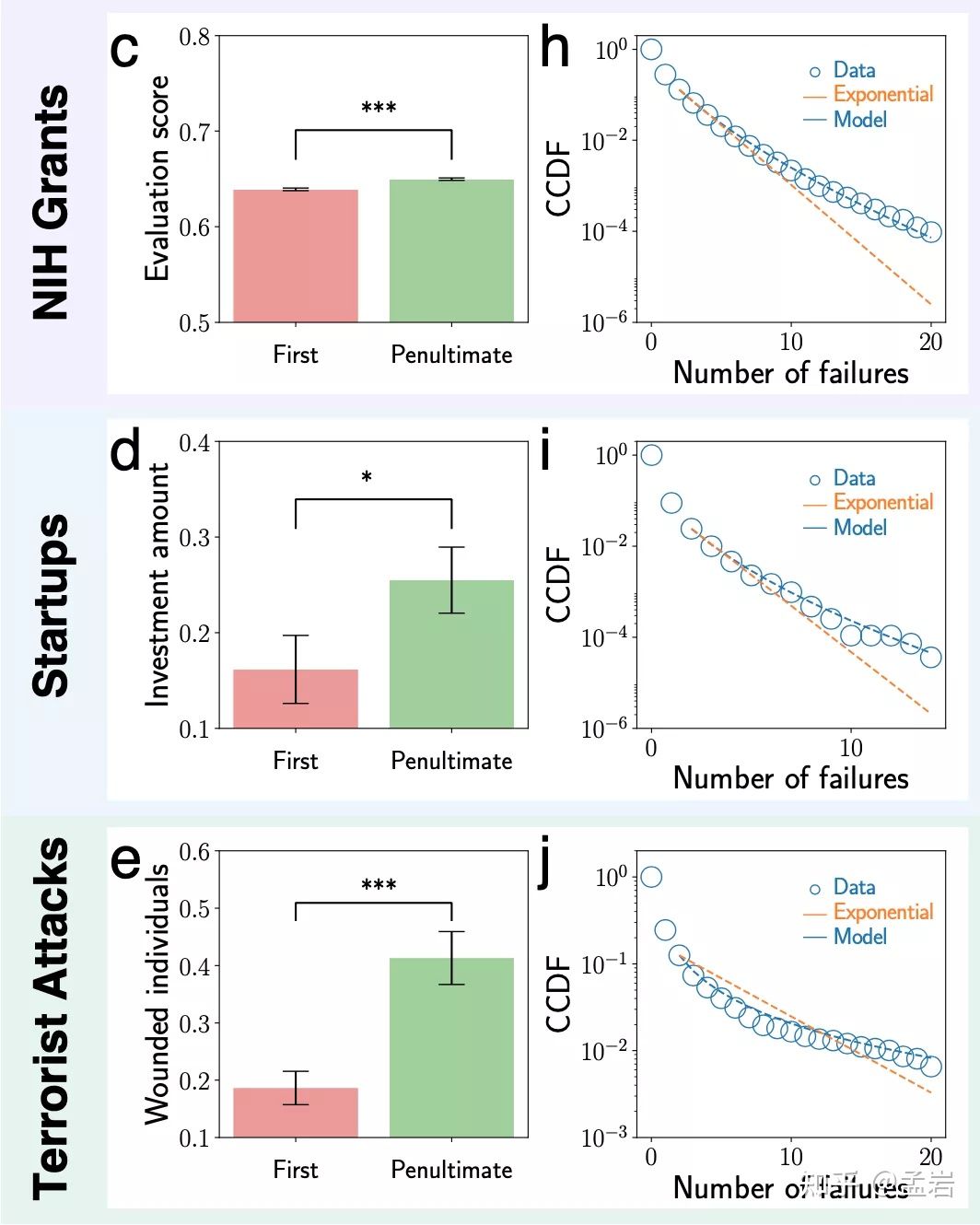 但是,当科学家把上述三个样本集的真实数据进行统计后,他们发现最终的失败分布曲线都遵循「肥尾分布」,不但没有比「运气」模型的指数型尾部要窄,甚至还要更宽。