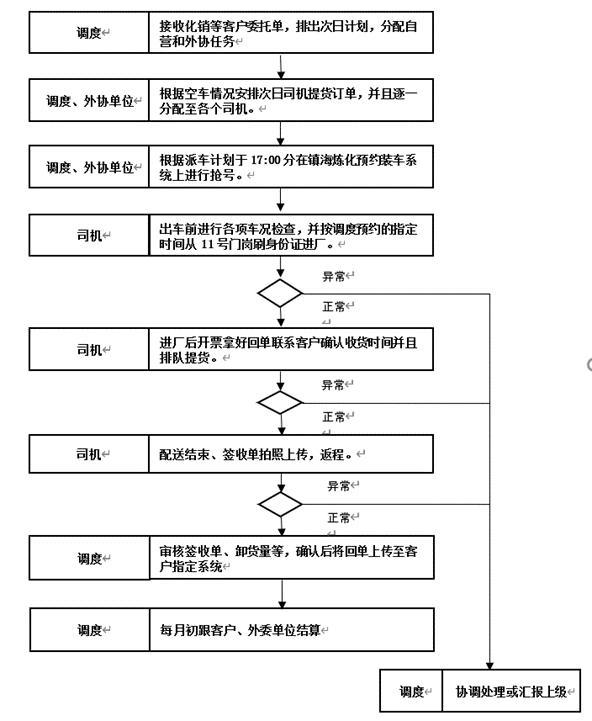 宁波镇海炼化港安化工销售有限公司向我公司下达运输委托单,我公司根据委托单上的装货地点,进入宁波镇海炼化利安德化学有限公司车辆预约系统,输入车牌和人员信息,进行装货预约,预约成功后,安排预约完成的环氧丙烷专用运输车辆和人员,按照预约时间到达宁波镇海炼化利安德化学有限公司装货站台。前往装货站台前,司机在能化链微信公众号上点击“发车”,达到装货站台装货。装货完成驶出宁波镇海炼化利安德化学有限公司大门,点击“装货”及填报装货数量后,送往上海抚佳精细化工有限公司。从发车开始,车辆轨迹、货物流向、驾驶行为等图形化信息,向宁波镇海炼化港安化工销售有限公司平台推送,宁波镇海炼化港安化工销售有限公司可以及时掌握自身货物运输信息,是否安全、准时到达,是否有货损都是实时反映出来。案例二:华昊供应链管理(温州)公司企业合成树脂10万吨/年采购、仓储、配送综合服务案例物流合同:2020年华昊供应链管理(温州)有限公司向中国石化化工销售有限公司华东分公司采购合成树脂10万吨。根据我公司与中国石化化工销售有限公司华东分公司签订的合同,全部由我公司负责从生产企业至华昊公司配送综合服务。物流流程:镇海炼化(宁波镇海)——我公司中转仓库——华昊供应链管理公司(温州)。业务操作流程:中国石化化工销售有限公司华东分公司向我公司下达运输委托单,我公司根据委托单上的装货地点,分为镇海炼化合成树脂装车台和中转库,中转库是租用我公司旗下子公司宁波市镇海实华仓储有限公司仓库。进入镇海炼化合成树脂装车台装货,需要进入镇海炼化预约系统进行预约,流程如下:如图3-4。