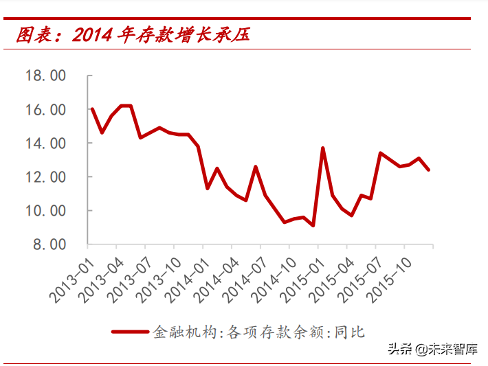 非对称降息下银行净息差确定性收窄;另在金融脱媒背景下,行业存款 增长整体承压。资产端:贷款重定价预计大部分发生在 2015 年中,若 后续不再降息,2015 年中息差才能完成探底。而这轮宽货币周期较长, 直至 2015 年底降息才停止。负债端:面对理财、宝宝类产品的分流, 银行存款增速持续下滑。