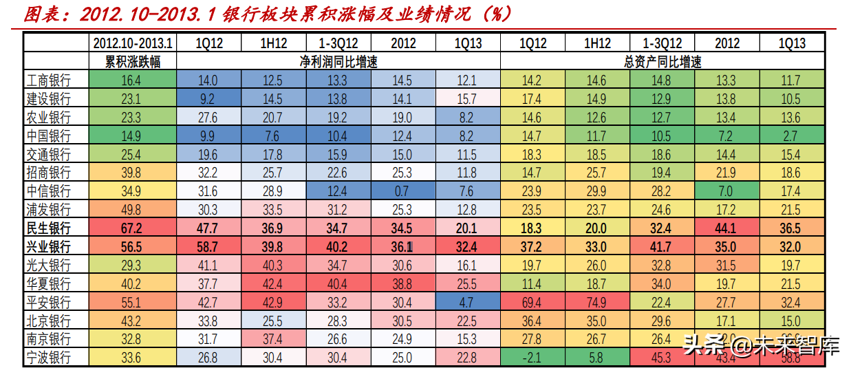 2012 年 10 月-2013 年 1 月这轮行情中涨幅靠前的依旧是股份行和城商 行板块,股份行表现更好于城商行,这一轮经济修复支撑点依旧是基建 和地产扩张,但受限信贷监管,更多以表外和同业业务的形式体现;股 份行更受青睐的一个大背景是当时的利率市场化改革,多元化经营的股 份行更有抵御息差收窄的可能。从板块盈利驱动因子同比拆解来看, 2012 年大行、股份行和城商行全年资产规模平均增速分别为 14%、26% 和 26%,股份行资产扩张增速与城商行接近。