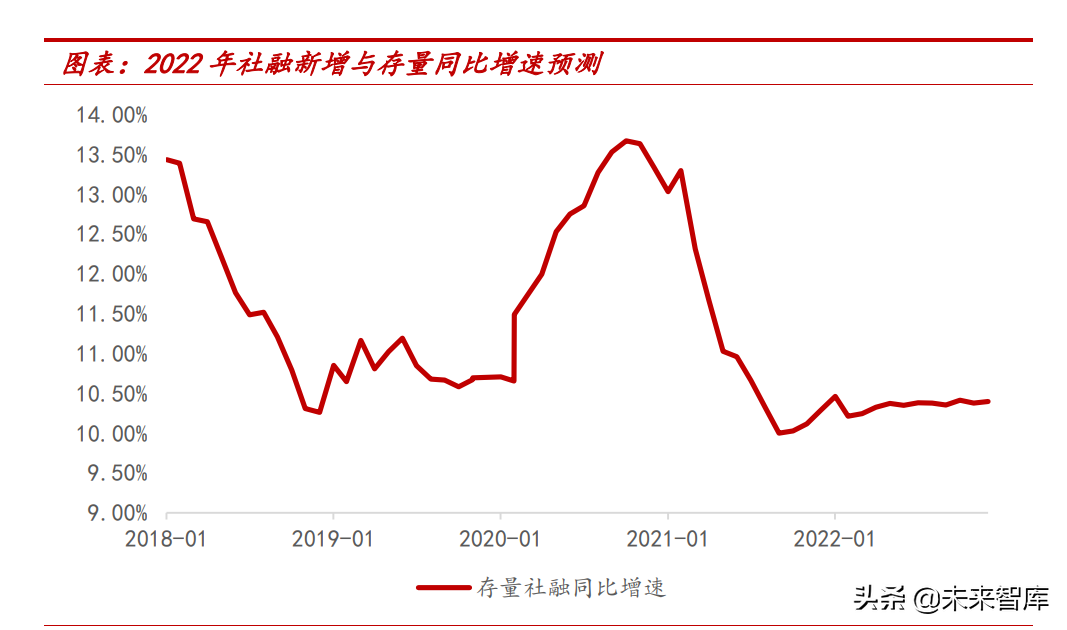 3、 企业债预计新增 3.7 万亿,较去年同期多增 4000 亿。企业债融资恢复 常态,与 2019 年和 2021 年的 3.3 万亿规模比较接近,微增的假设主要 基于基建发力,城投发债相应有所增加。4、新增信托、委托贷款预计 净增-2 万亿,净增规模较去年同期微升 700 亿。随着大部分银行在满足 资管新规方面处于处臵后期,22 年新增信托和委贷的缩量会好于 21 年。 5、其余分项假设与 21 年大体接近。6、最终测算得 22 年新增社融预计 为 33 万亿,较 21 年多增 1.7 万亿,全年存量同比增速为 10.4%。22 年社融处于磨底企稳阶段。