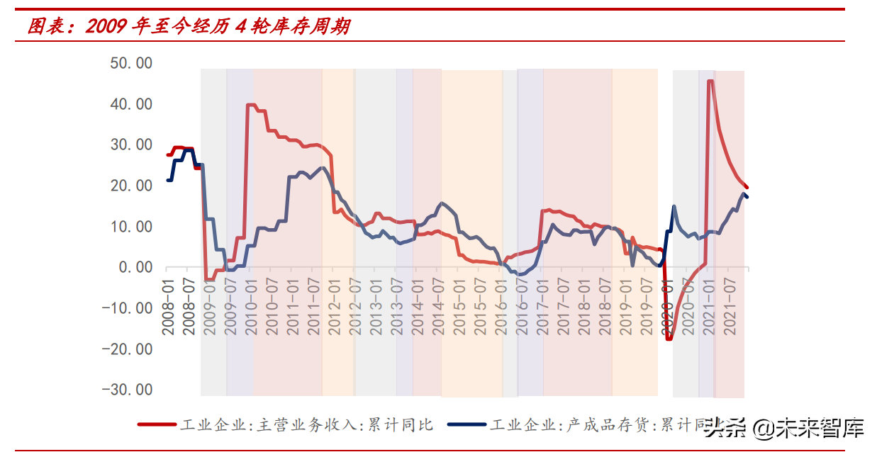 被 动补库:需求不会无限扩张,当需求扩张到达一定上限,企业收入增速 放缓,但企业调整生产的反应会慢于需求表现,库存开始被动积累。指 标表现为工业企业营收同比增速向下、而库存增速保持向上。