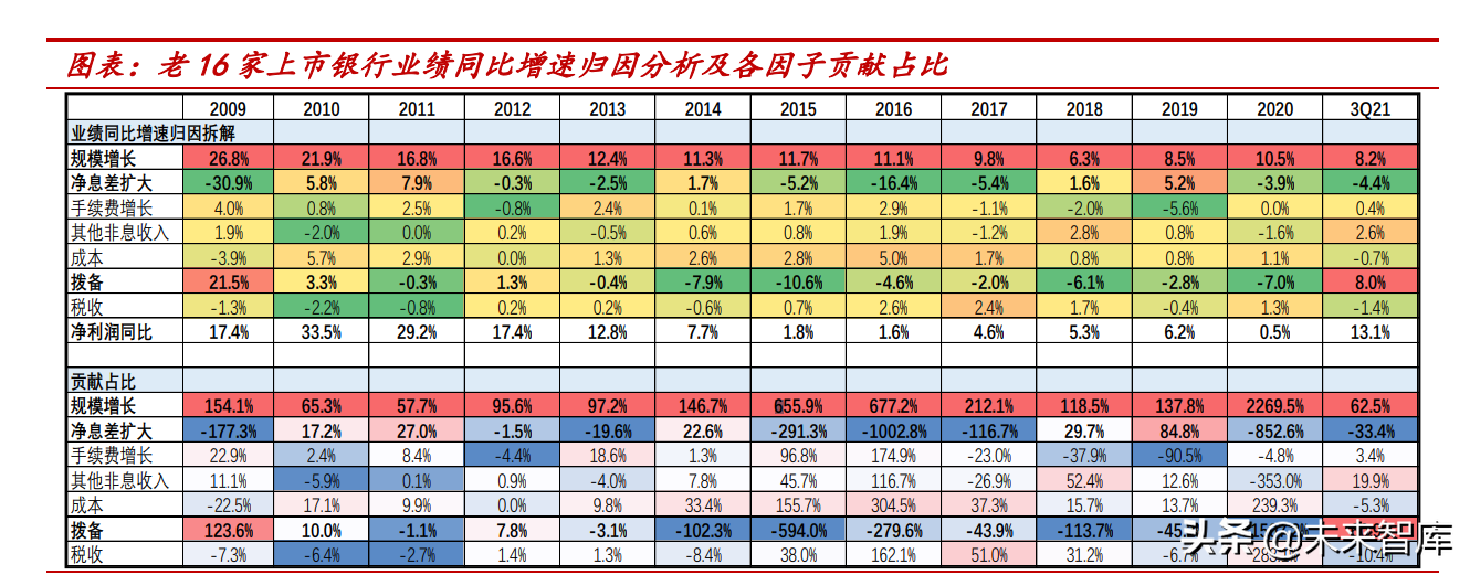 不同经济周期阶段,银行的主核心驱动因子也有变化:1、2009-2013 年是规模主驱动,4 万亿刺激计划下,银行处于信贷规模高增期。2、 2014-2016 年规模、息差和拨备共同驱动,经济处于阶梯式下行期,信 用风险开始暴露,同时逆周期降准降息政策下,银行息差收窄。3、 2017-2019 年息差转正向贡献,拨备负向拖累减弱。供给侧改革带来经济复苏,银行对企业贷款议价能力提升,资产质量好转。4、2020 年规 模主驱动,疫情冲击背景下,银行让利实体、息差收窄;同时加大不良 处臵力度,拨备拖累幅度较大。2021 年银行资产质量包袱卸下,轻装上 阵,拨备正向贡献业绩。