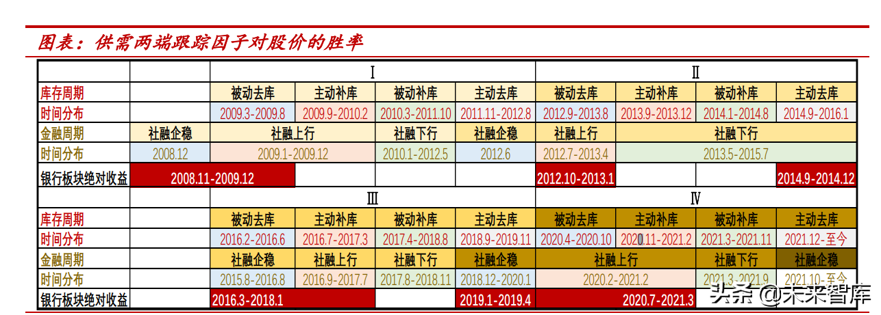 供给视角看:6 轮大的绝对收益行情的启动,其中 3 轮落在社融企稳期, 分别为 2008 年、2016 年和 2019 年。2 轮落在社融上行期,分别为 2012 年和 2020 年。1 轮在社融下行期、为 2014 年。供给端视角对板块行情 有一定的前瞻指引。需求视角看:4 轮行情落在被动去库阶段,即经济复苏期,分别为 2008 年、2012 年、2016 年和 2020 年。2 轮落在主动 去库阶段,对应经济萧条期,分别为 2014 年和 2019 年。落在主动去库 阶段的行情有一定的抢跑,在经济企稳证伪以后随即回撤,由此可见需 求端视角对板块的长牛行情胜率更高。